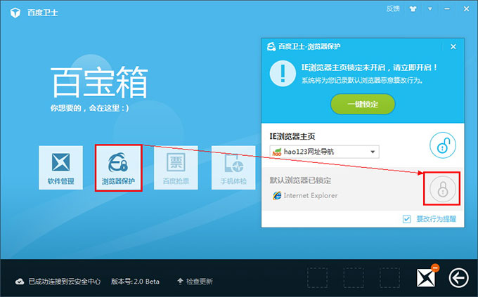第一步:打开百度卫士——点击百宝箱——点击浏览器保护