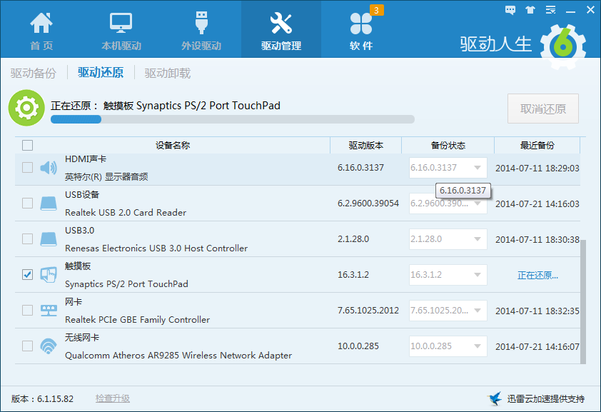 如下图所示,由于在更新触摸板驱动的过程中,小编误操作了驱动人生,所以导致更新失败。此时,打开驱动人生驱动管理的驱动还原版块,勾选触摸板驱动,点击还原按钮。触摸板驱动开始进行还原。