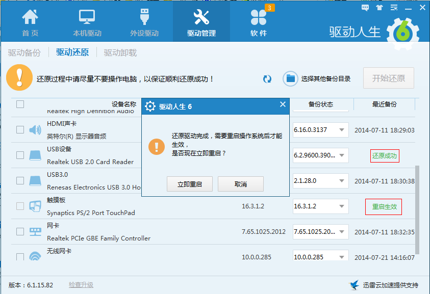驱动还原成功之后,驱动人生会弹出小框温馨提醒,是否需要立即重启电脑,并提醒已经还原好的驱动重启生效。这个小提醒可以使您很清楚的了解驱动的还原情况,做到心中有数。