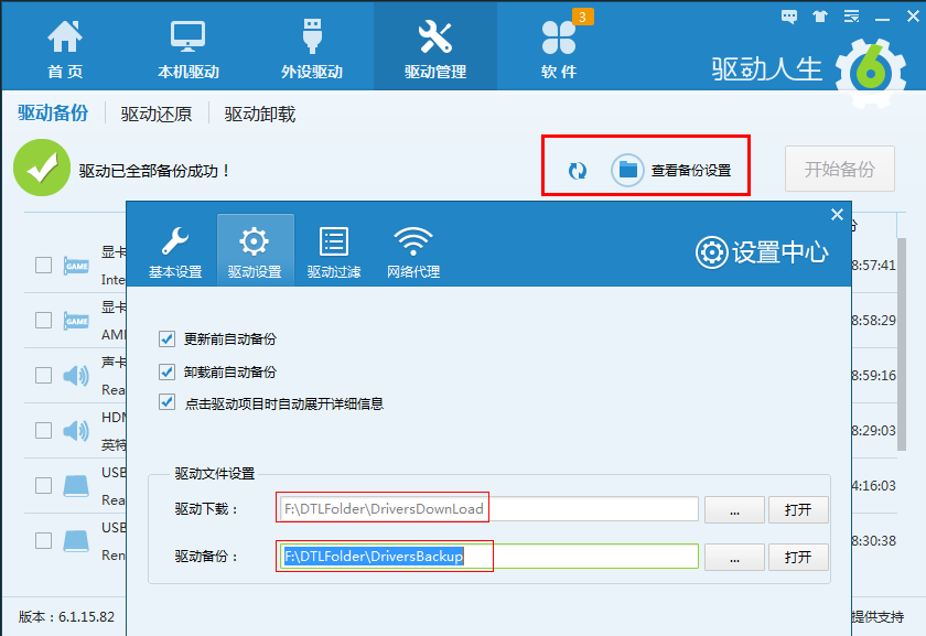 打开驱动人生驱动管理的驱动备份页面,查看备份设置。如果您没有对此部分进行设置,那么您下载安装任何一个驱动前,系统会自动给您的电脑备份好原有的驱动,在默认备份路径F:\DTLFolder\DriversBackup保存。