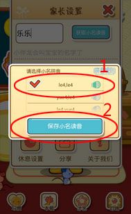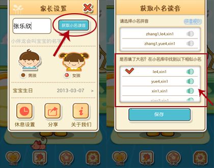 3.点“获取小名读音”后,会弹出的列表框,里面显示你刚才输入的小名拼音(上滑列表查看更多),选中相应小名,点“保存小名读音”即可。关闭“家长设置”回到主界面,点点小伴龙,发现他已经会叫你的名字了。
