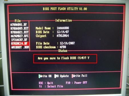 1-4. 询问是否确定要 Update : Are you sure to flash BIOS (Y/N)? Y (按Y)