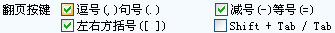 选中的键就可以用来进行翻页。其功能相当于PageUp(上一页)和PageDown(下一页)。推荐用“逗号(,)句号(。)”来进行翻页,因为用“逗号”“句号”时手不用移开键盘主操作区,效率最高,也不容易出错。搜狗同时默认支持“减号(-),等号(=)”、“左右方括号[]”来进行翻页。