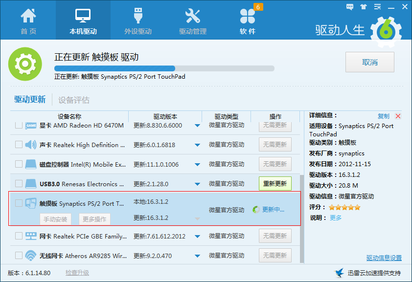 您可以先用驱动人生6卸载掉原来的触摸板驱动,然后再重新检测一遍电脑驱动,将触摸板驱动更新一遍,重启电脑之后重新测试触摸板是否可用。