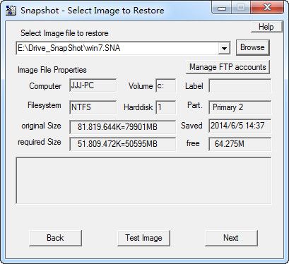 选择一个位置来存储磁盘映像。如果需要,一个扩展名。“.SNA”将被附加到文件名。您可以输入一个注释,当灾难来袭时确定恢复镜像更容易。
