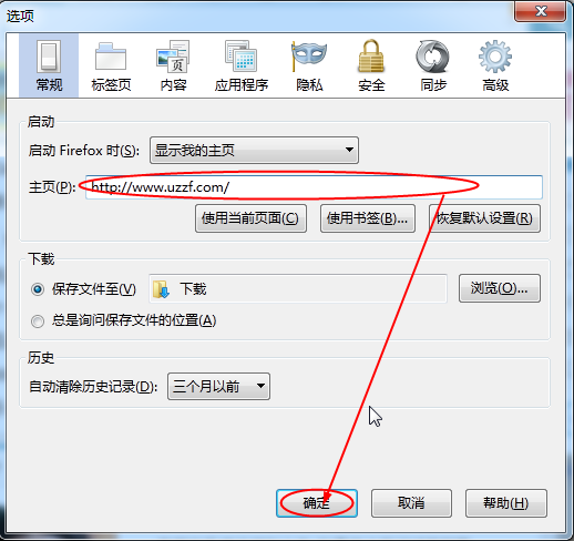 然后弹出一个窗口,在常规选项卡内,把启动Firefox时,设置为启动主页,主页网址栏内输入主页网址。点击右下角的确定即可。