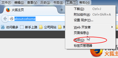 打开火狐浏览器,点击【工具】——【选项】如图所示。