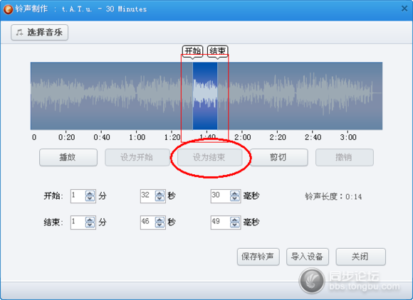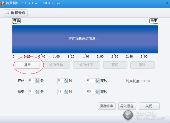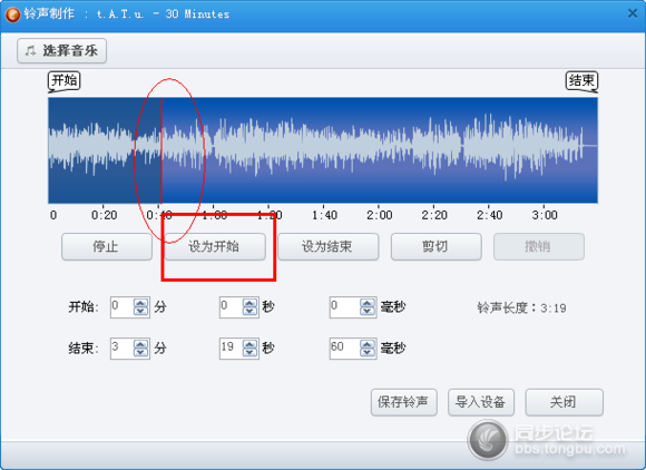 (打开mp3后,如图试听,然后选择你想作为铃声的某一段,设为开始,设为结束)