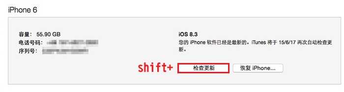 4、接着按住键盘上的 Shift(Option),同时鼠标点击 iTunes 界面的【检查更新】按钮,再选择对应版本的 iOS10 beta1 固件进行升级。