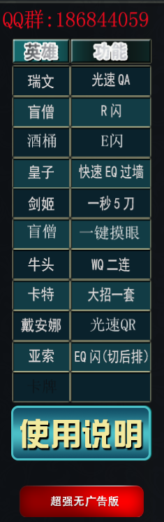 目前有穿越火线、英雄联盟两个游戏的辅助,据说后续还会增加逆战、地下、飞车等游戏的辅助,因为软件没有修改游戏参数,所以绝对不会被封。现在的功能有!