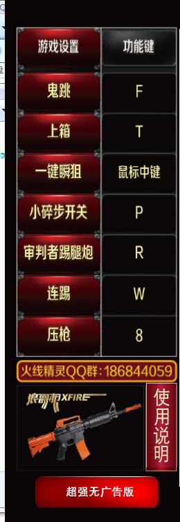 穿越火线:一键上箱,一键鬼跳,一键上高箱,一键瞬狙,小碎步,自动压枪,审判者连踢,审判者踢腿炮。
