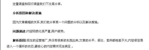 5、通过定性调查,我们了解了最一手的信息,很多都是颠覆了我们以往的看法的。比如,用户最最最想解决的问题,我们通过线上文章分享的方式,只能是可遇而不可求,有冲突的地方,所以要探寻其他的方式。再比如,用户所讲的同质化严重的问题,并不是指你和同行的同质化,而是自身文章的同质化。定量调查和同行调查我们下次再分享。
