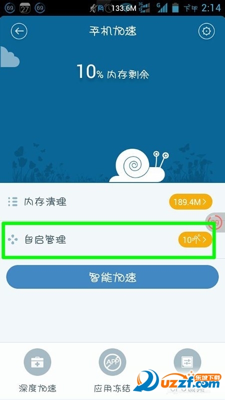 在手机加速中使用“自启管理”项,进入自启软件设置。