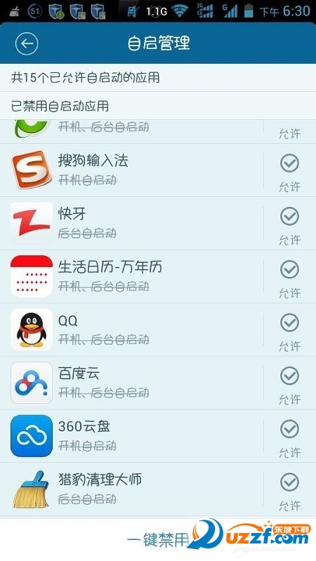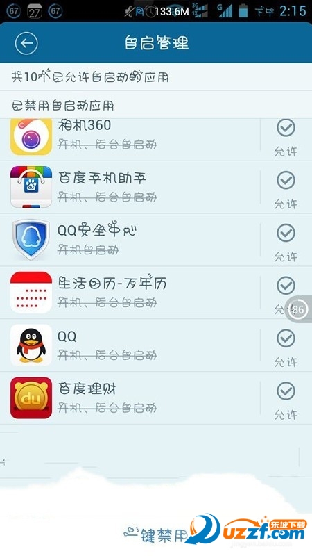 接着,我们使用手机中安装的安全卫士或者垃圾清理软件设置一下自动启动软件名单。