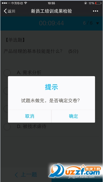 4、(4)如果考试题目未完成而点击提交试卷,系统将会提醒确认是否交卷,如下图: