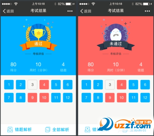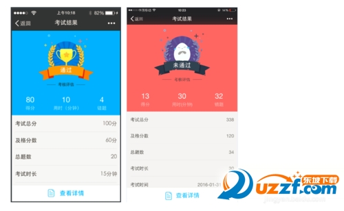 已通过和未通过,用户点击列表可以查看考试的基本信息和考试结果的信息,并且可以点击查看解析详情,如下图: