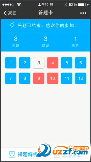 2、在考试结果页面点击【查看详情】,将会跳到答题卡页面,用户可以点击【错题解析/全部解析】按钮进行查看答题解析。