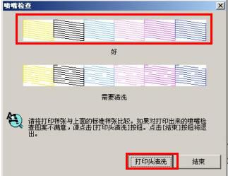 4.如果打印的喷嘴检查图案出现缺色或断线的情况,请选择“打印头清洗”按钮,清洗打印头如图(2)所示。在清洗过程中,当