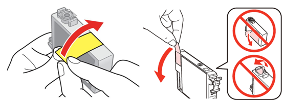 新购买的墨盒在打开内外包装后,可以看到墨盒上有一条黄色胶条,更换墨盒前,必须将此封条揭下后再安装到打印机上,如图(1)。