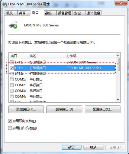 4.在客户端电脑,点击“开始”→“设备和打印机”右键点击打印机图标选择“打印机属性”→“端口”,确认已经选择LPT2端口,完成设置,如图(6)。