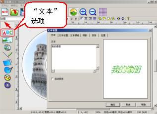 3、编辑光盘文字:如果需要添加一些艺术效果的文字,请点击左侧工具栏中的“文本”选项(ABC图标),弹出窗口后在文本框输入想要打印的文字,并可进行字体、颜色等的编辑,如图(4);