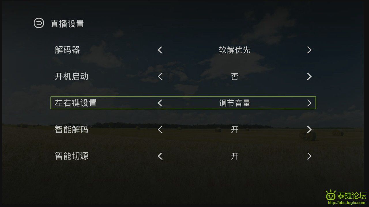 4、方向键:在直播界面里,上下键是切换频道节目,左右键为调节音量。在TV2.4版中,你还可以把直播中的左右键调整为切换视频源,这个操作建议您只有你的遥控器有数字键才设置哦!不然是没法选集的哦!