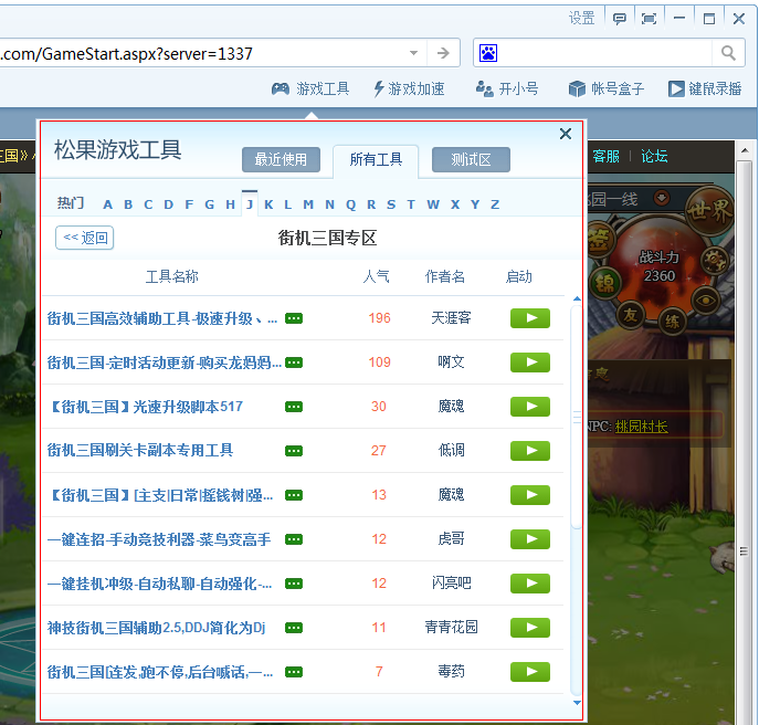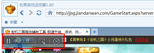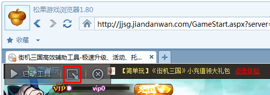 3、进入游戏后,将松果游戏浏览器窗口最大化且前端显示,点击工具栏内的“游戏工具”按钮,如下图: