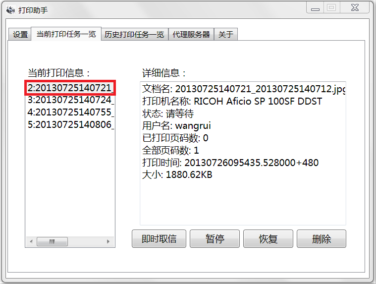 如图所示,选中某一个打印任务可以查看该打印任务的详细信息。