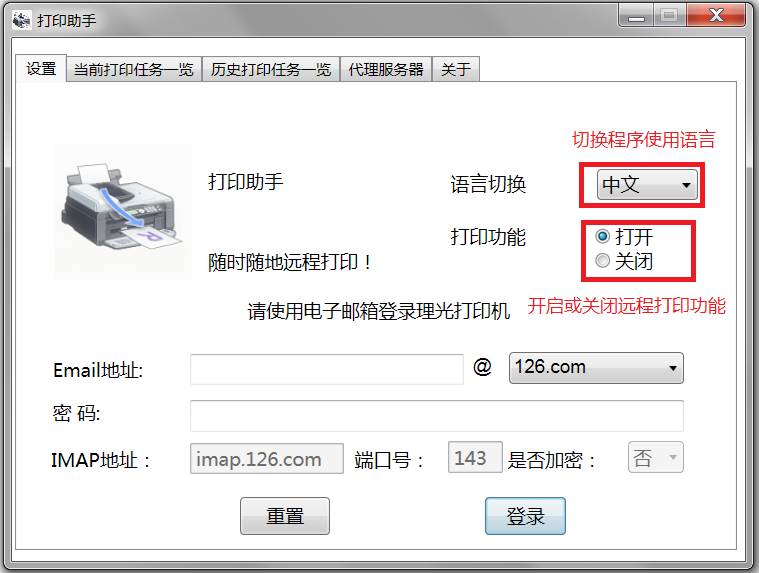 选择一个邮箱用于远程打印,使用该邮箱进行登录。如果是打印助手默认支持的四类邮箱(网易126邮箱,163邮箱,gmail邮箱和QQ邮箱),则无需设置IMAP地址、端口号和是否加密。如是其他邮箱,请用户自行配置这几项。