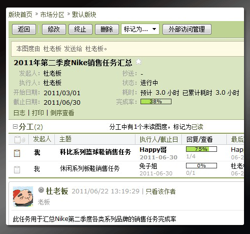 输入主题“2011第二季度Nike销售任务汇总”,填写相关内容,添加分工主题及相关执行人。