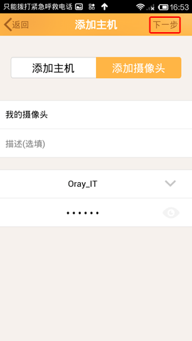 选择“添加摄像头”,填写摄像头名称,描述、选择可使用的wifi并输入密码,点击“下一步”
