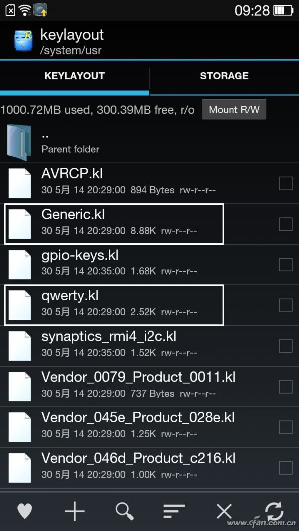 好消息是,我们可以通过修改Android系统的配置文件解决上述困扰。需要注意的是,在进行下面操作之前,请确认你的手机已经Root并安装了RE文件管理器。笔者的手机为OPPO N1 mini(高通方案),通过RE文件管理器找到/system/usr/keylayout目录,其中的generic.kl和qwerty.kl就是需要我们修改的两个文件(图2)。