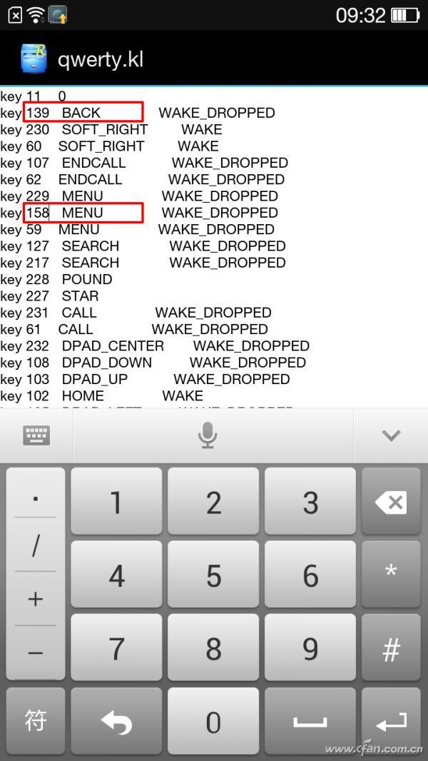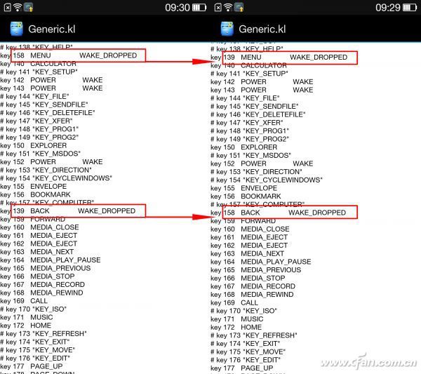 分别点击两个文件,并选择以“Text Editor”(文本编辑器)的方式打开。在generic.kl文件中,这款手机“key 139”和“key 158”键值默认为MENU(菜单)和BACK(返回),所以我们只需将139和158两个数值互换一下即可(图3)。同理,我们还需要将qwerty.kl文件中139和158的键值位置互换(图4)。