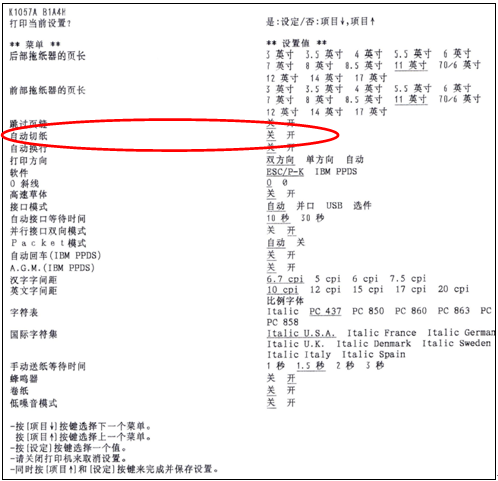 4.1 需要打印打印机的当前缺省设定值:按下“切纸/纸槽(设定)”按键,则打印出全部当前设置(见图三)。可以看到:“自动切纸”选项值为“关”。建议:打印出当前的缺省值。