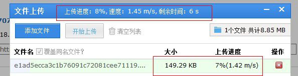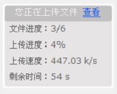 在文件上传的过程中,文件上传的顶部会显示“上传进度”、“速度”、“剩余时间”选项。