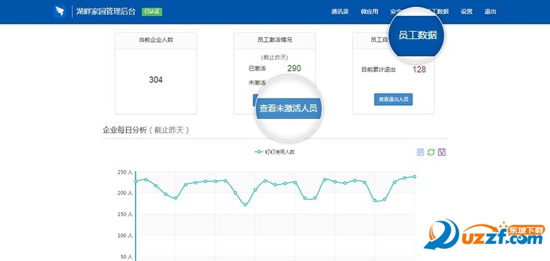 登录企业管理平台,点击右上角“员工数据” 进入企业员工数据页面,可查看员工使用钉钉的情况,也可以查看导出未激活的员工,发送短信邀请激活。