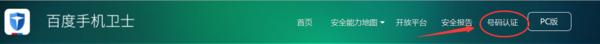 1、登录pc版的百度手机卫士官网 http://shoujiweishi.baidu.com/,点击右上方号码认证;
