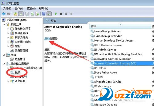 在打开的“计算机管理”界面中,展开“服务”列表,从中找到“Internet Connection Services(ICS)”服务并选中,点击“启动”按钮开启该服务。