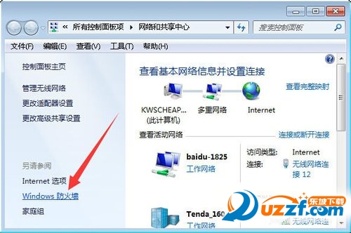 设置允许“一键WiFi”通过防火墙:打开“控制面板”-“网络和共享中心”界面,点击“Windows防火墙”按钮进入。