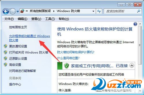 接着在打开的“Windows防火墙”界面中,点击如图所示的“允许Windows程序或功能通过防火墙”按钮。