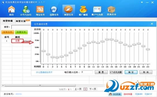 5、任务发布后,我们还可以对其进行曲线设置,如下图所示,点击“设置”就会出现“任务曲线设置”的页面。根据我们店铺的实际情况设置相应的任务完成时刻表,设置完成后点击“确定”即可。如果未设置的话,我们就按默认值进行任务。