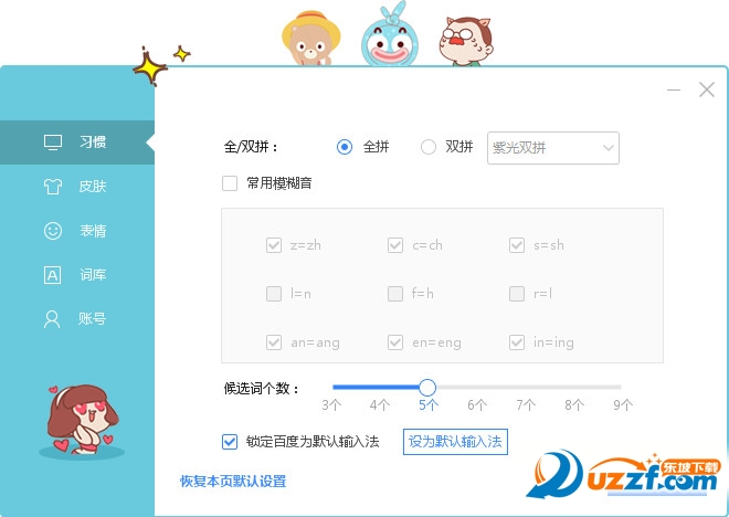 2、首次进入先进入快速设置,用户可以设置全拼或双拼,以及锁定百度为默认的输入法;