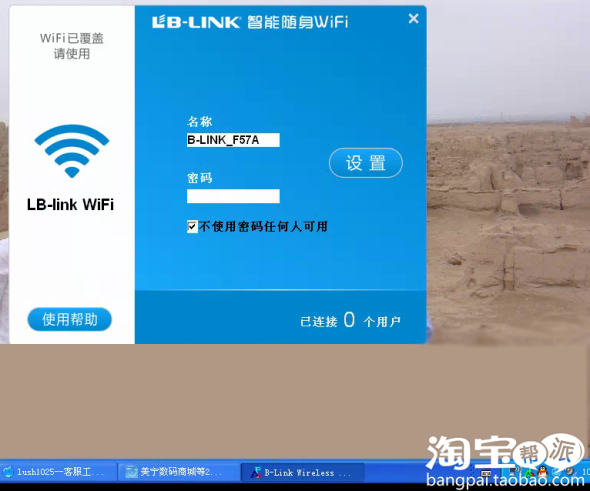 到此为止,驱动已经安装完毕并发射了WIFI,无线名称为:B-LINK_F57A,密码为空,当然这里大家可以自定义无线网的名称和无线密码(把勾去掉就可以输入密码啦),输入完毕点击“设置“即可。
