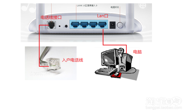 首先把电话线接入宽带猫的电话线接口,再从猫的的Lan口接一根网线到路由器的Wan口,然后在路由器的任意Lan口接一根网线连接到电脑的网线接口上。如下图: