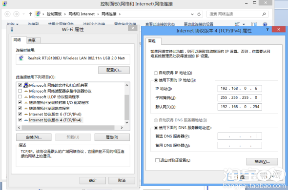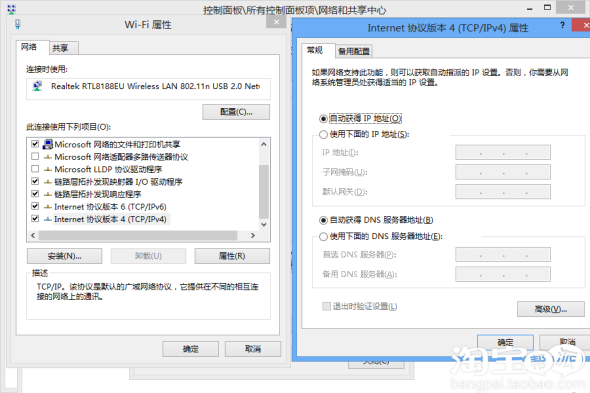 设置完成后,需要把无线网络连接/Wi-Fi的 Internet协议版本4(TCP/IPv4)修改为自动获得IP地址,自动获得DNS服务器地址。点击确定后即可开始网上冲浪。