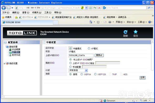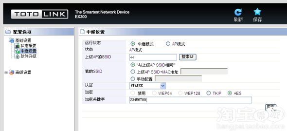 选择AP后,请在加密关键字处输入上级AP无线信号的无线密码。点击应用