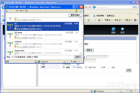 点击搜索AP后出现搜索信号页面,选中需要中继的无线信号后点击选择AP。