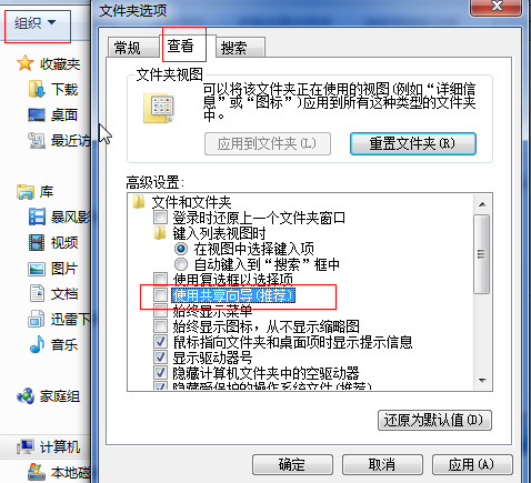 1、打开“我的电脑”→“组织→文件夹选项→查看”命令→去除“高级设置”选项下“简单文件共享”的选中状态