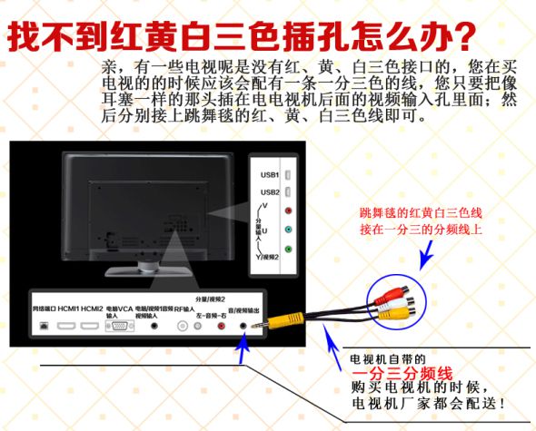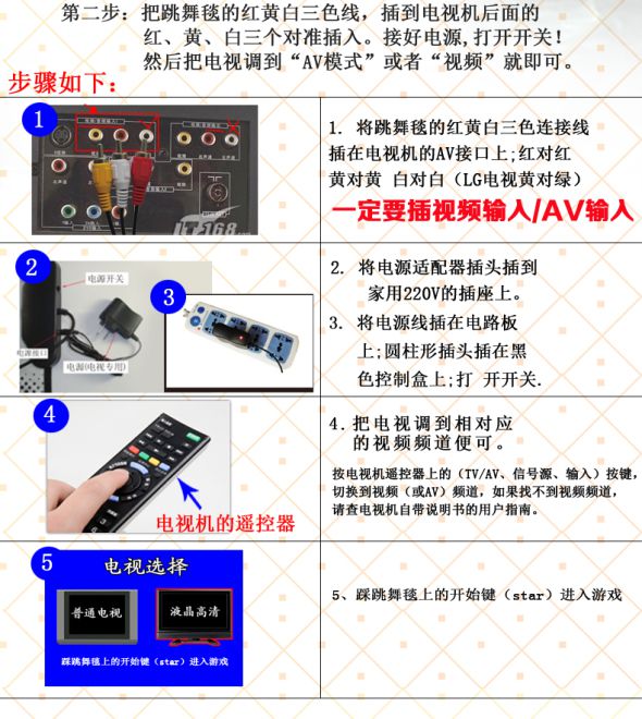 注意:现在部分品牌的液晶电视机有多组AV接口的,如果不知道 接哪一组 ,那就要每一组都试一下。2、如果您的电视有好几组红黄白接口,那就会有av1,AV2,AV3……等模式,试着用换其他的av模式。每换一个模式要稍微等一下,跳舞毯读取数据需要时间!