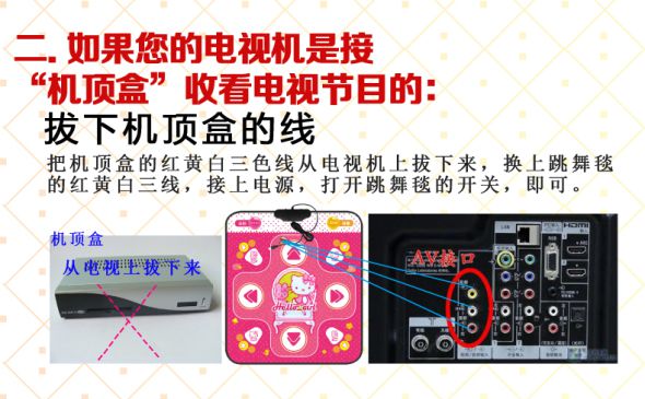首先要注意哦:接电视的时候,要拔除其他的视频设备 ,只留下跳舞毯链接电视。